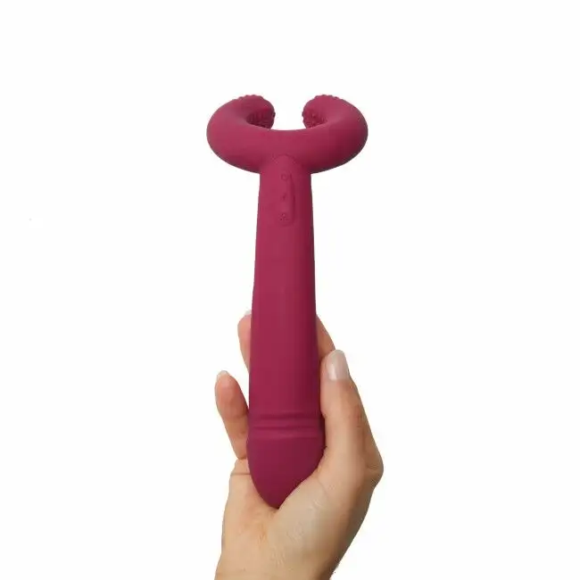 Первый мотор расположен на кончике вибратора, обеспечивая интенсивную стимуляцию самых чувствительных зон. Второй мотор расположен посередине вала, производя глубокие вибрации, которые заставят вас дрожать от удовольствия. И, наконец, третий двигатель расположен в основании игрушки и обеспечивает дополнительную стимуляцию клитора или промежности.
