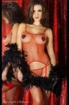 Прозрачный комплект в мелкую сетку. Состоит из маечки, стрингов, чулок на кружевной резинке и подвязки для чулок. Производитель - Chilirose.